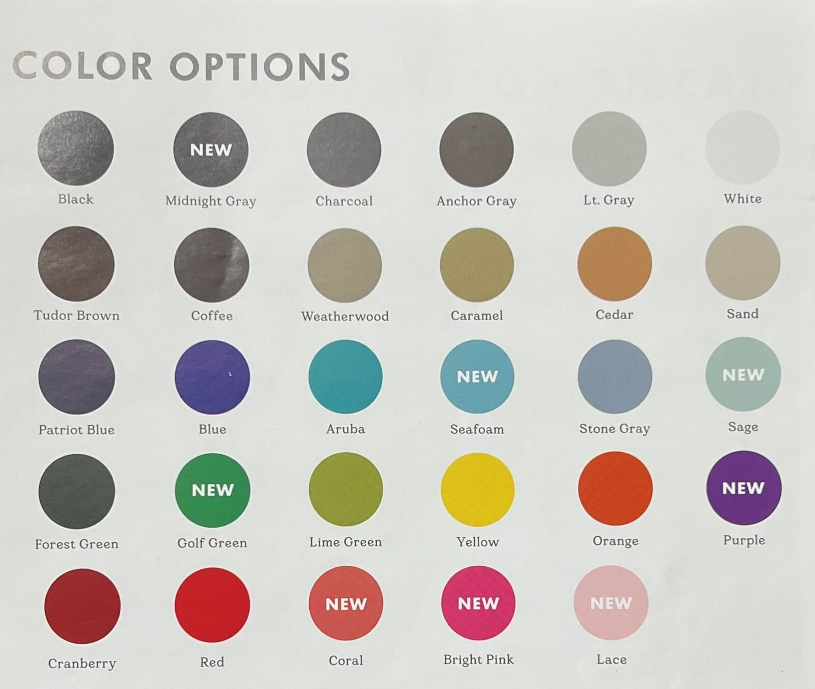 Variety of color options as well (see color chart).
